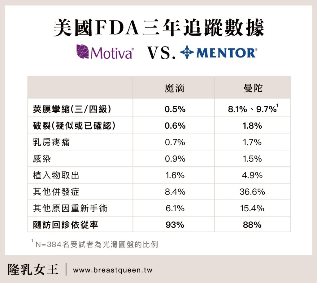 從美國 FDA 的3 年臨床數據來看,Motiva 魔滴的莢膜攣縮率僅為 0.5%,破裂率為 0.6%,在全球超過 85 國保持著極低的莢膜攣縮率 <1% 的安全標準;曼陀女王波莢膜攣縮率則為 8.1% (光滑面則更高達9.7%),破裂率則為 1.8%,代表著 100 人當中就有將近 10 個人會遇到莢膜攣縮的情況。